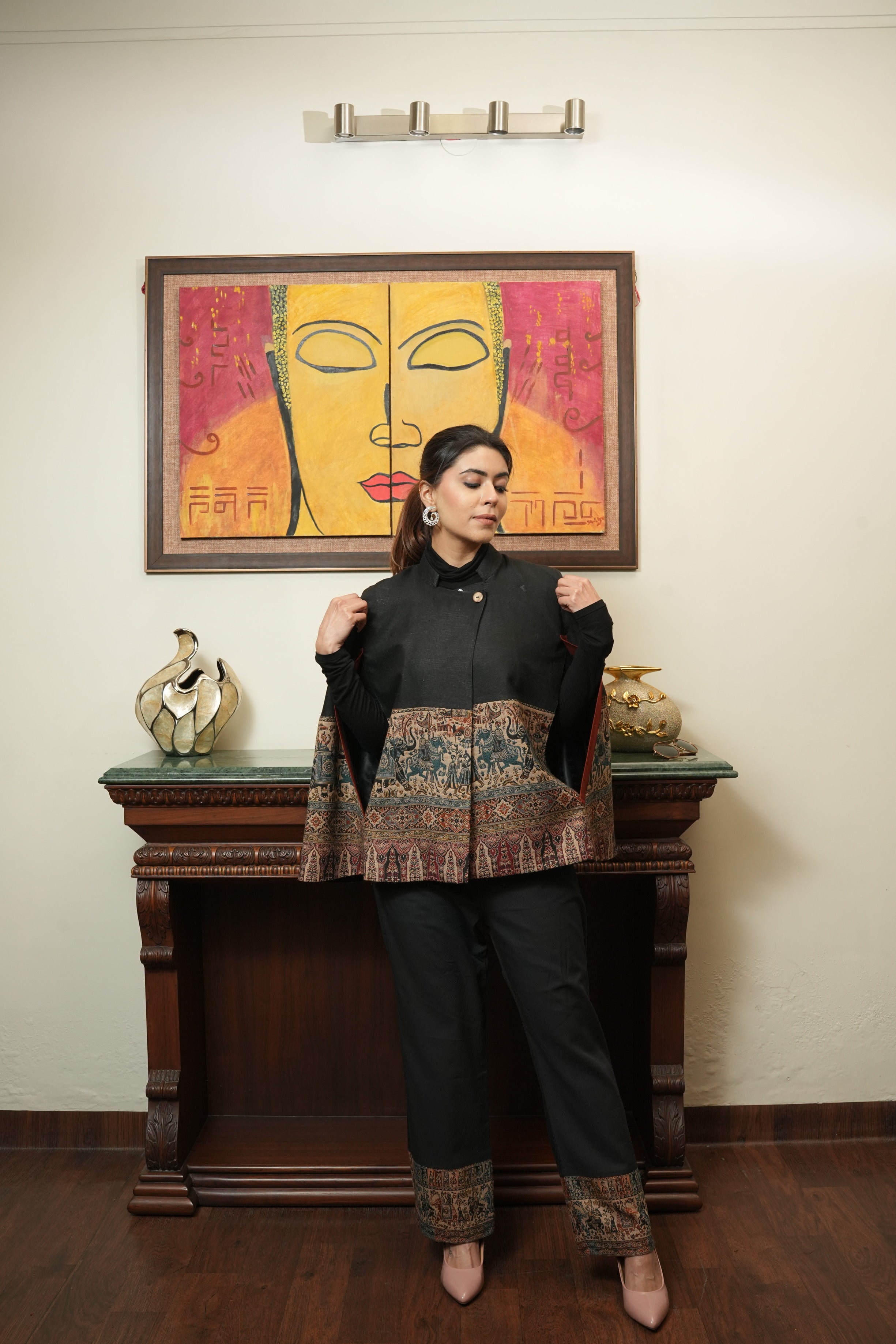 Majestic Pashmina Cape with Intricate Ethnic Border and Coordinated Pants