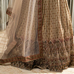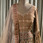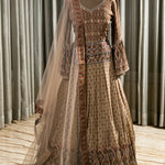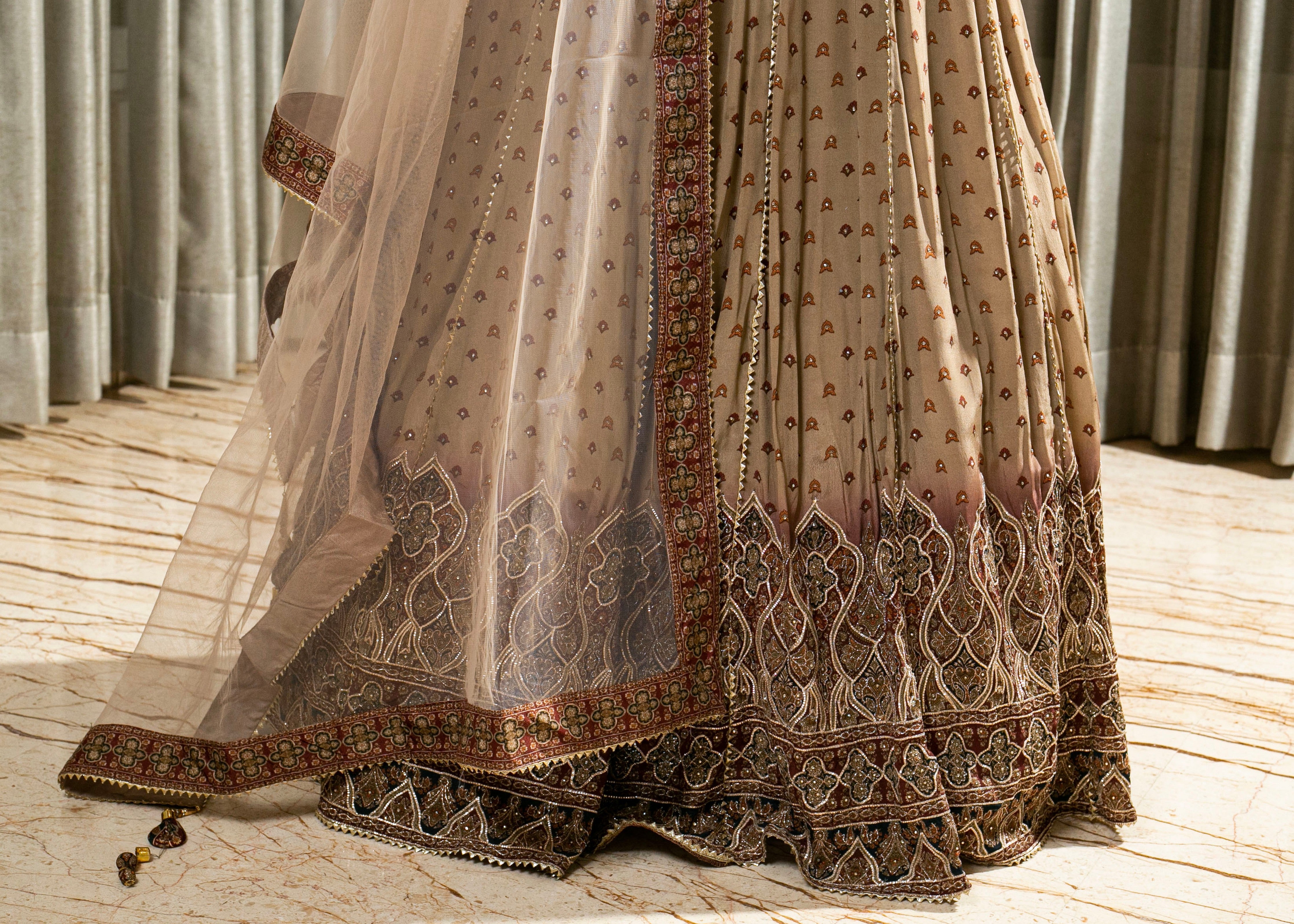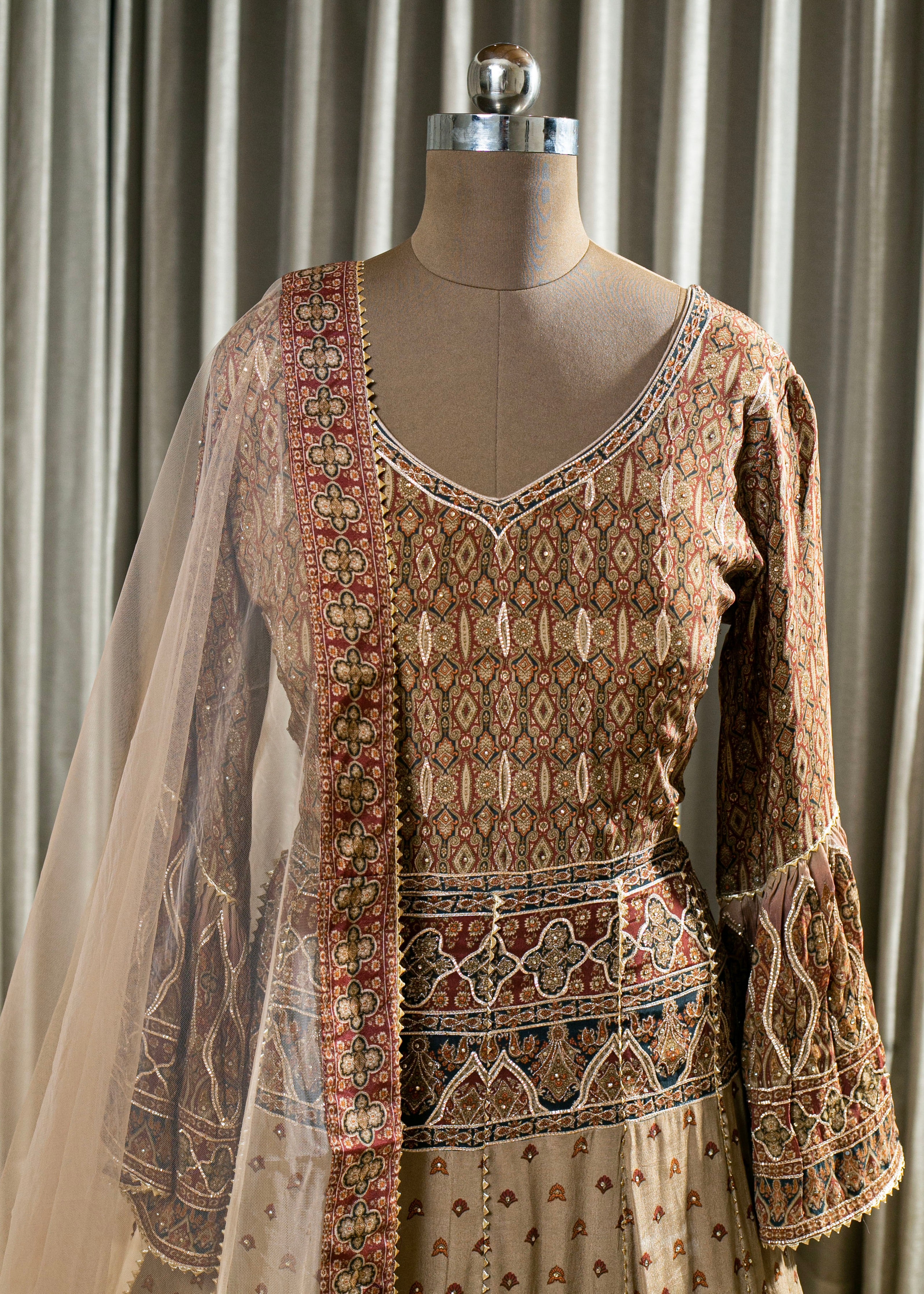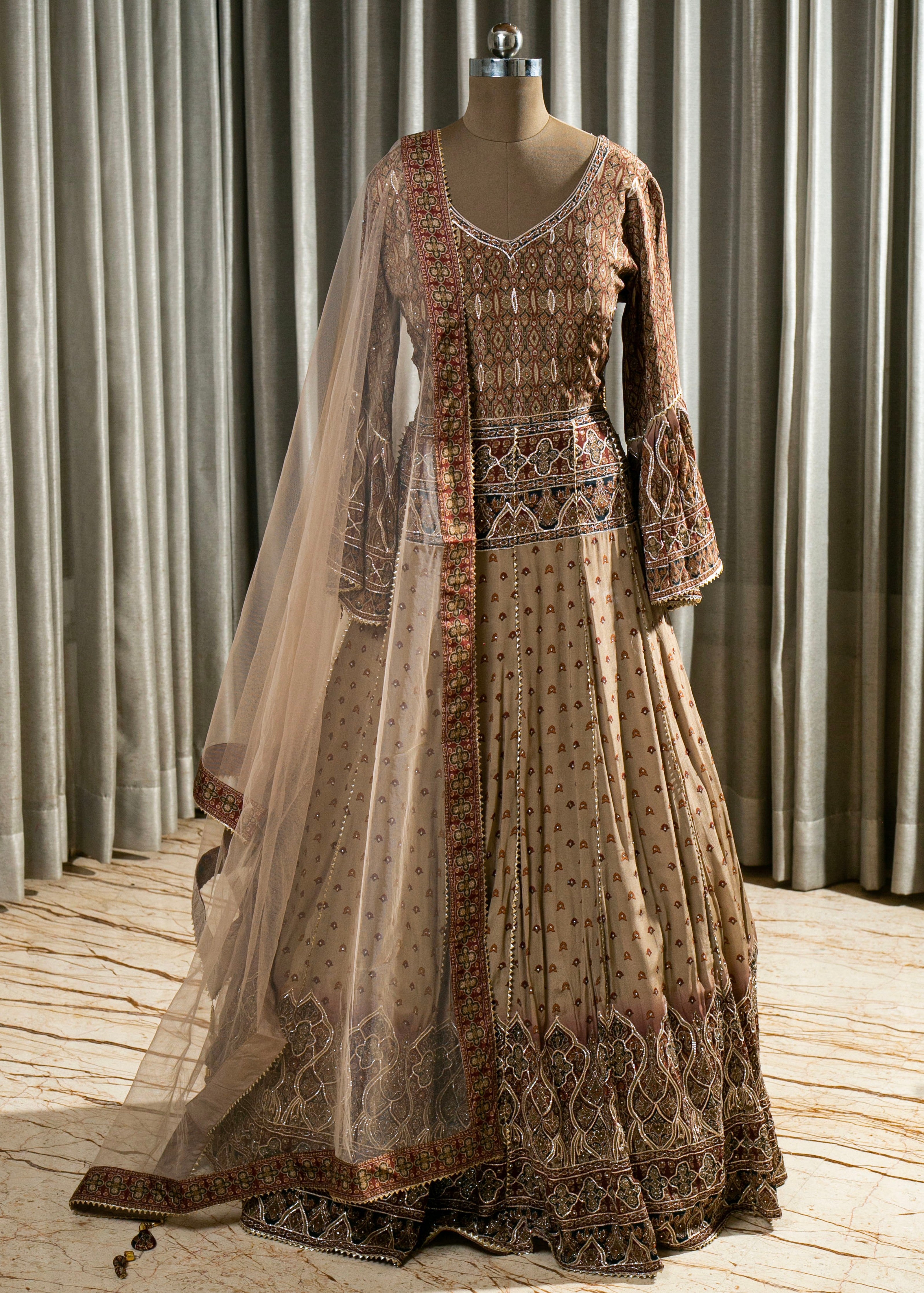 Make a statement in this beautiful flared beige maroon crepe silk dress with intricate and sophisticated gota work. The digital printed anarkali adds a touch of elegance to the overall look. The bell sleeves are highlighted with delicate embroidery, making it perfect for any occasion.