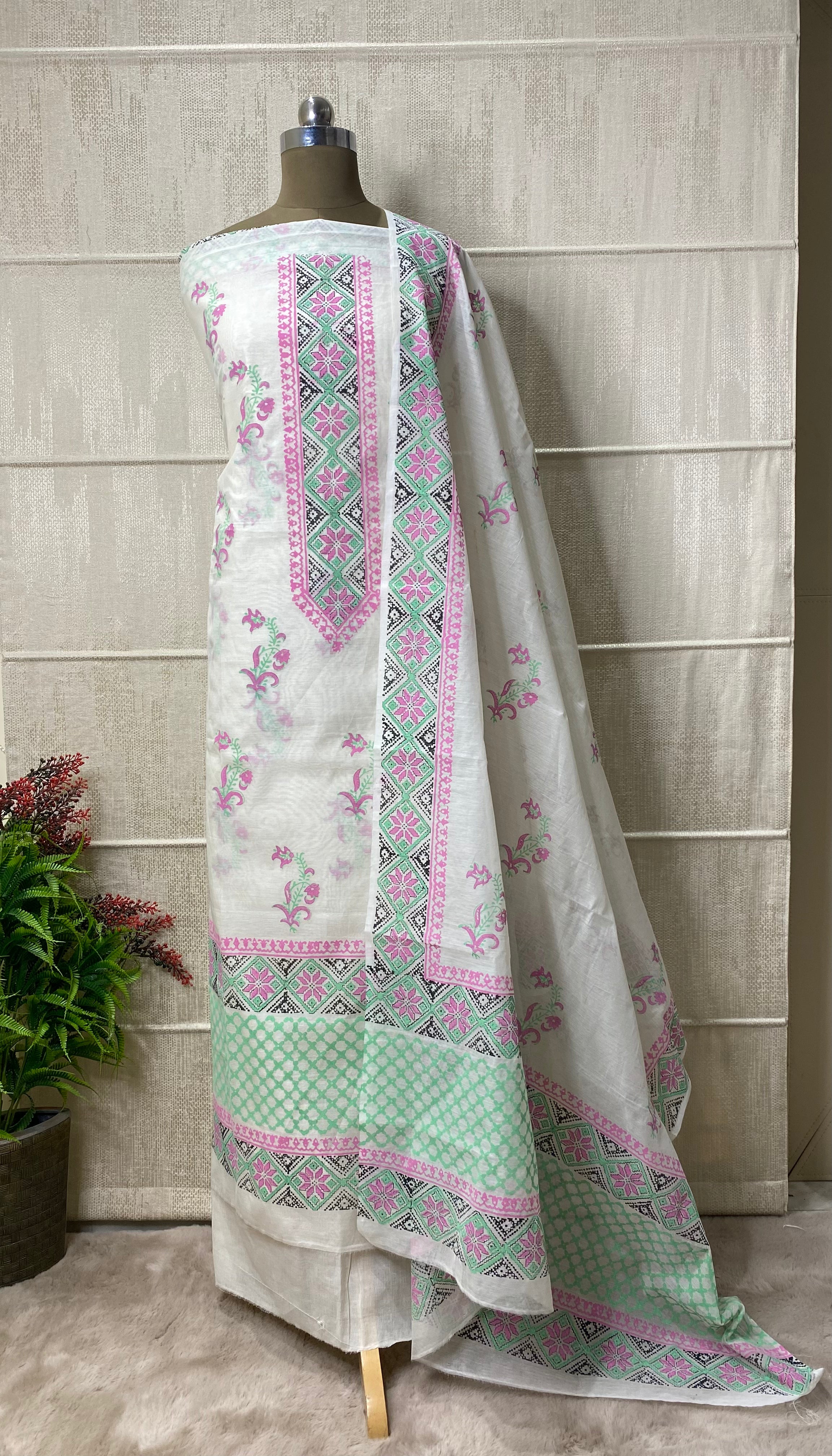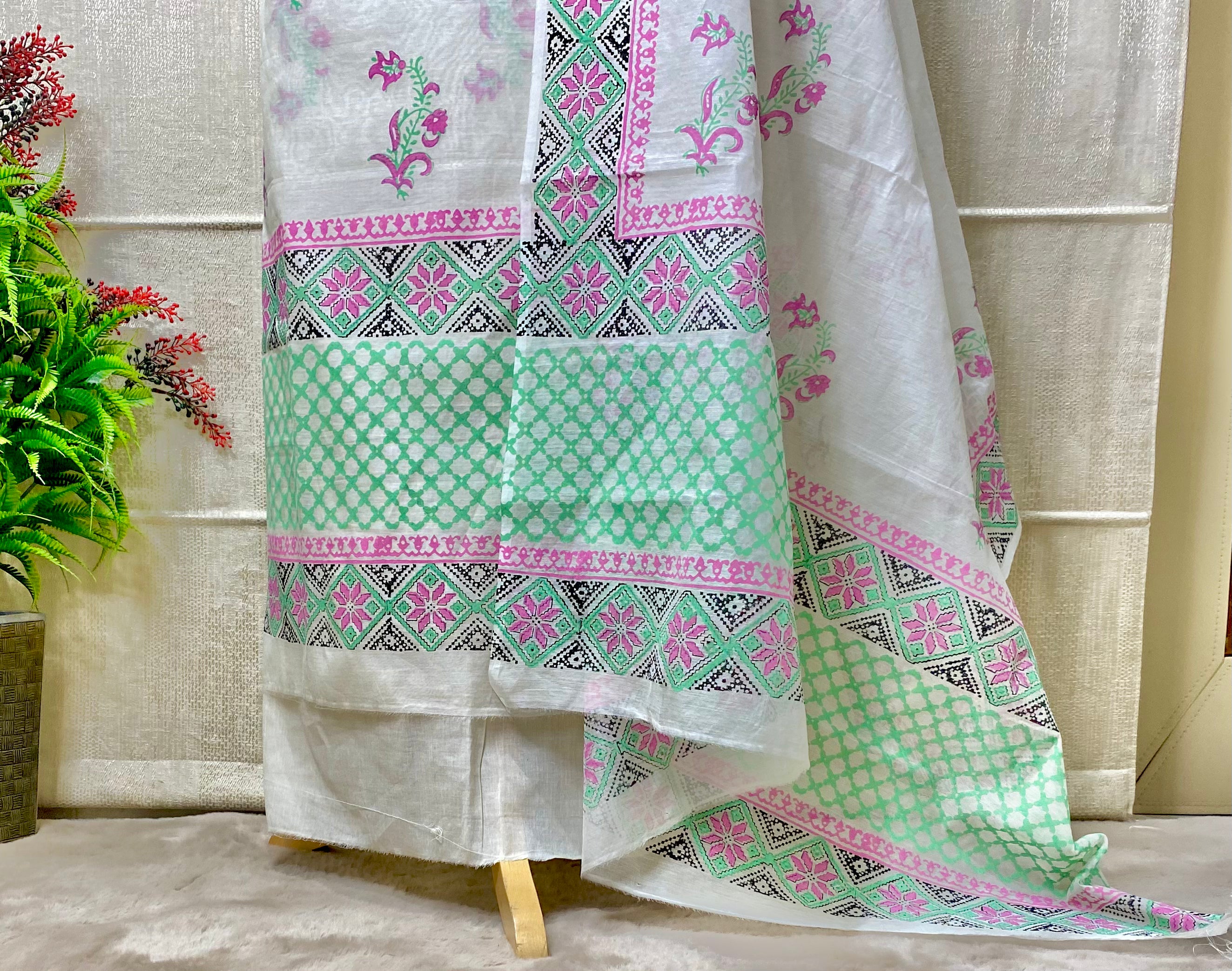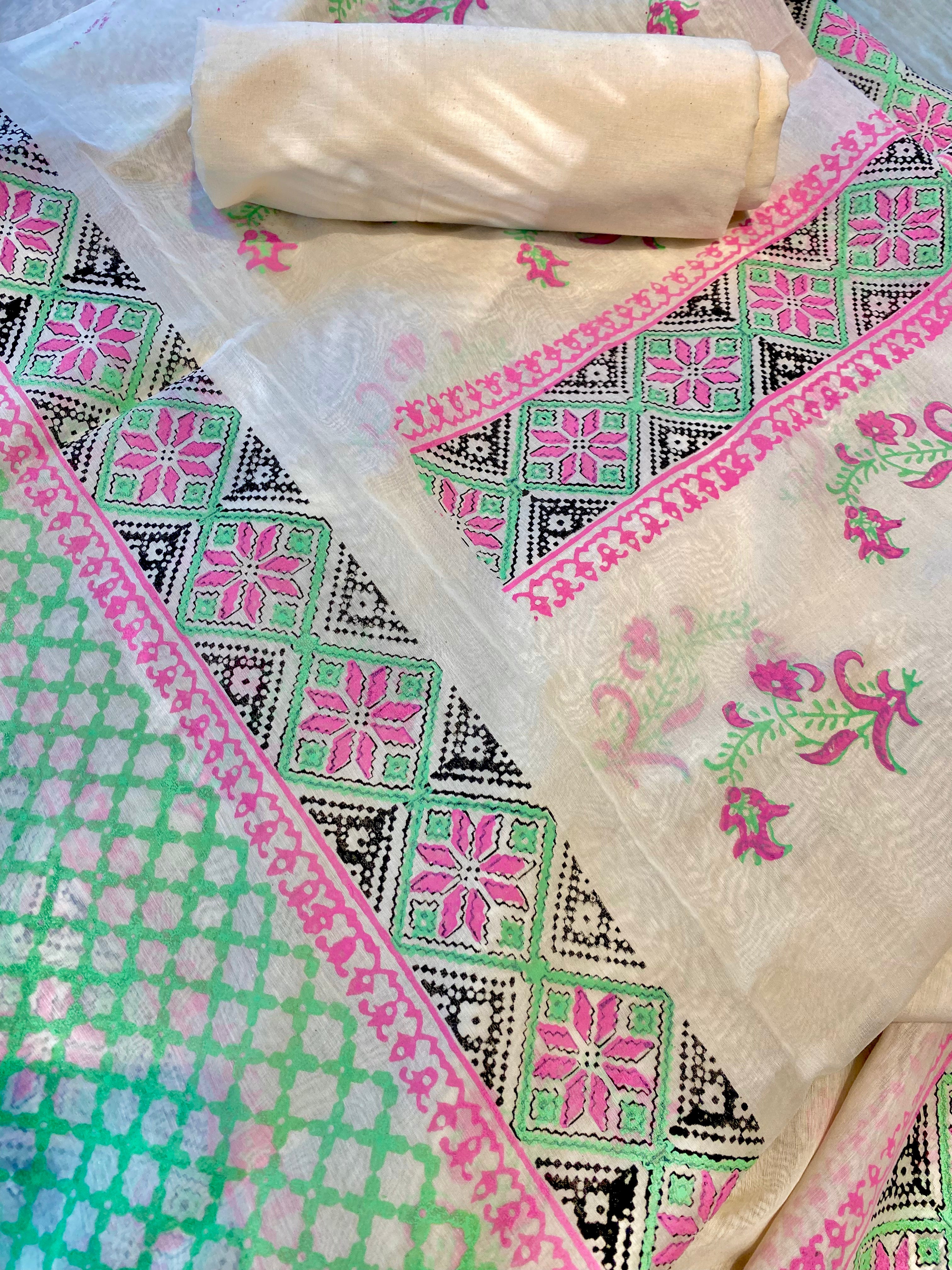 Hand-Blocked Chanderi Suit with Cotton Bottom and Dupatta