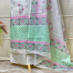 • Hand-Blocked Dupatta: The hand-blocked dupatta adds an extra touch of artistry, beautifully complementing the suit with its delicate patterns.