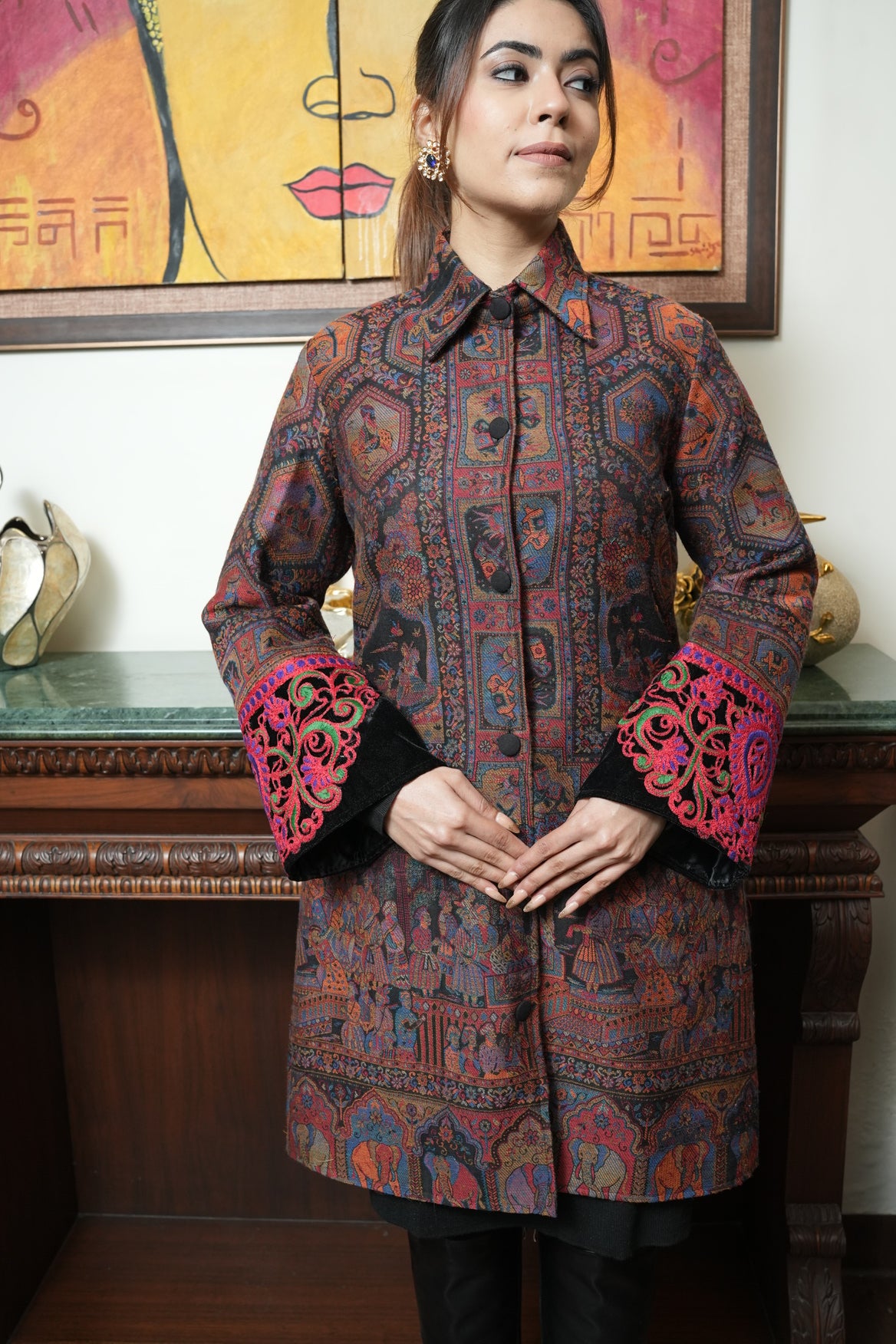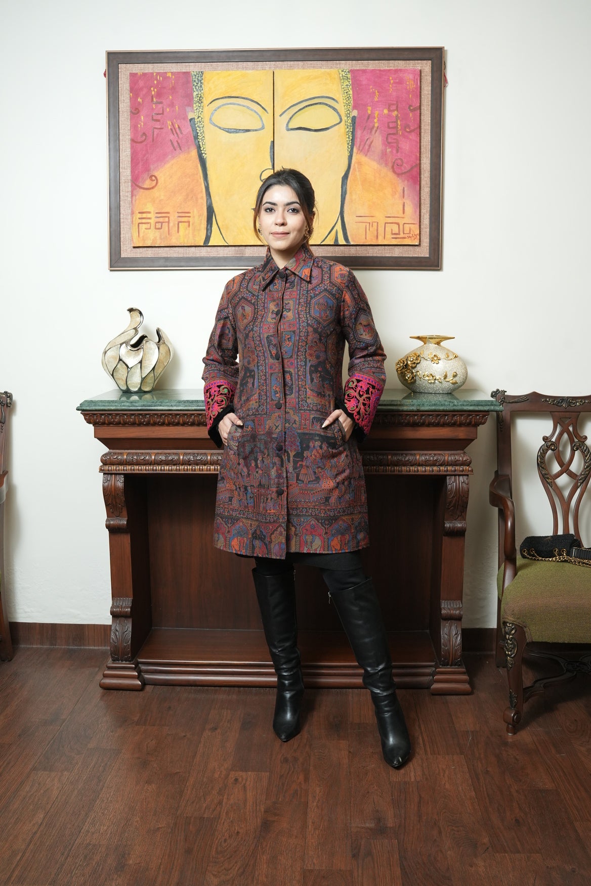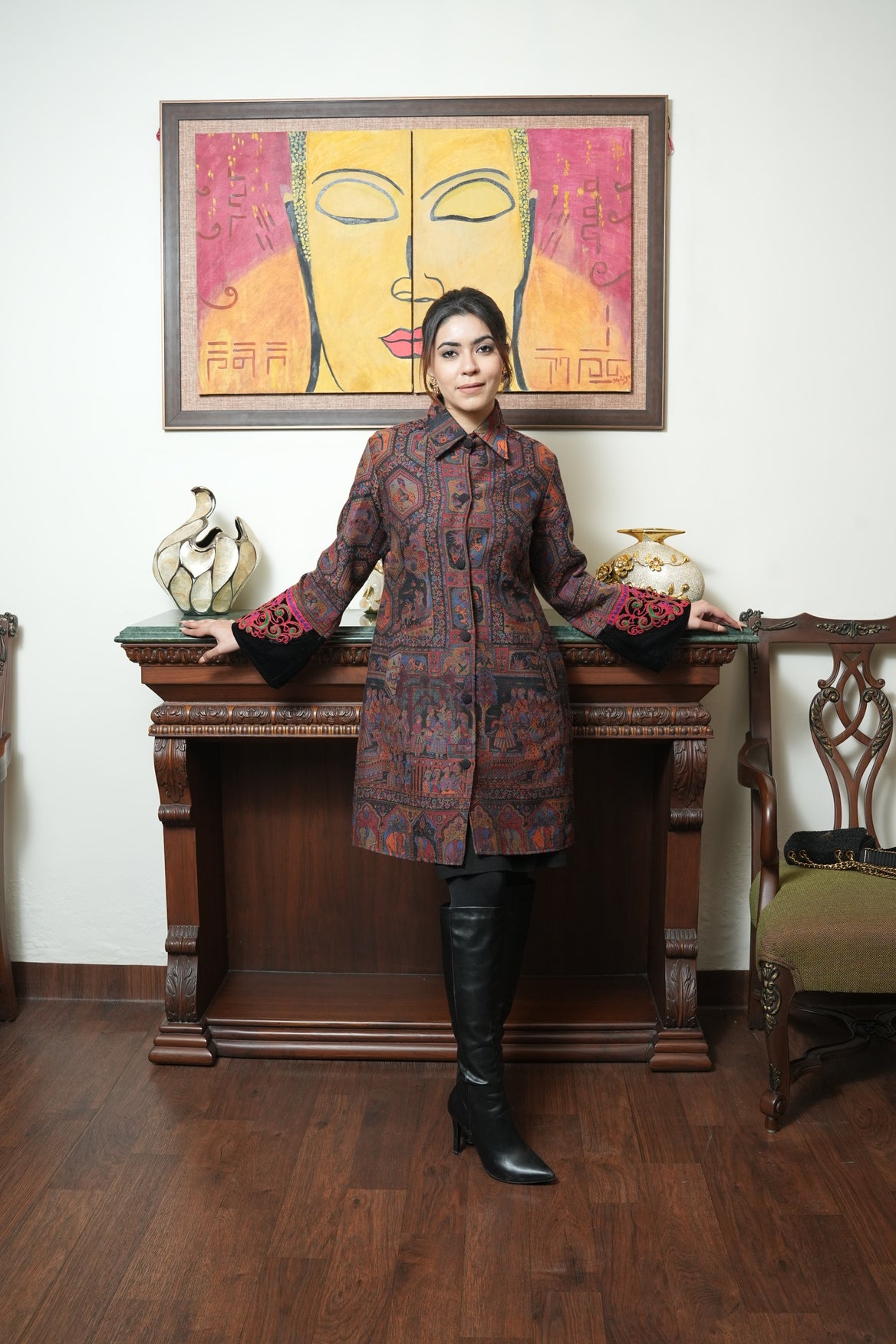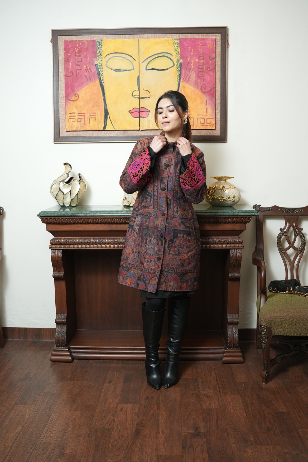 Elegant Black Pashmina Coat with Kashmiri Embroidery